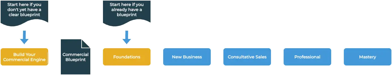 Strategy (“Build Your Commercial Engine”) → Foundations → New Business → Consultative Sales → Professional → Mastery